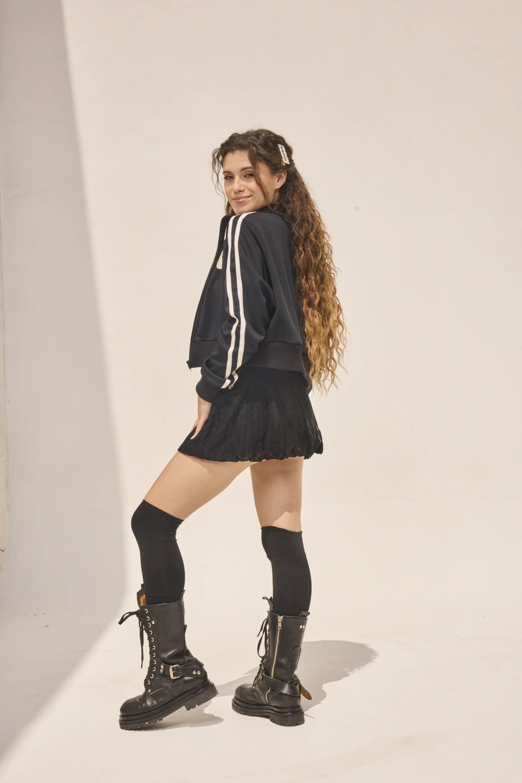 FALDA BALOON DE ENCAJE CON CINTURA EN JERSEY CON LYCRA. COMBINALA CON TOP SOL.  LA MODELO MIDE 1,55 M Y TIENE PUESTO UN TALLE S