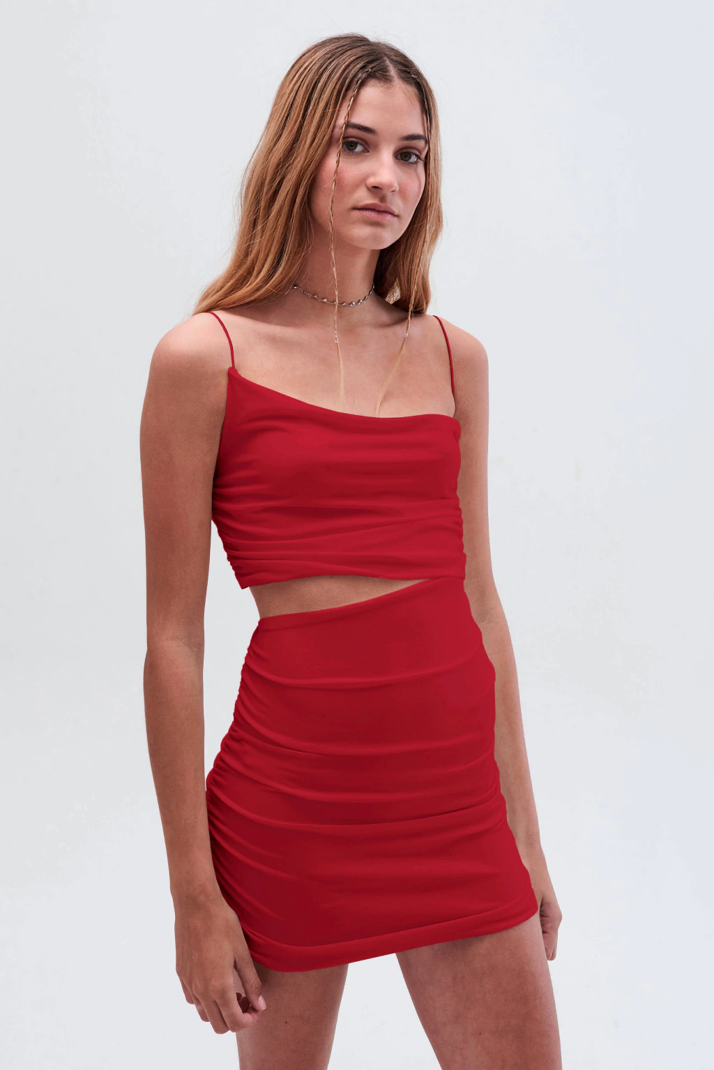 Descripción: Vestido de microfibra con corte asimetrico, breteles elásticos y cut out. Frunces laterales. La modelo usa un talle S y mide 1,70 mts.